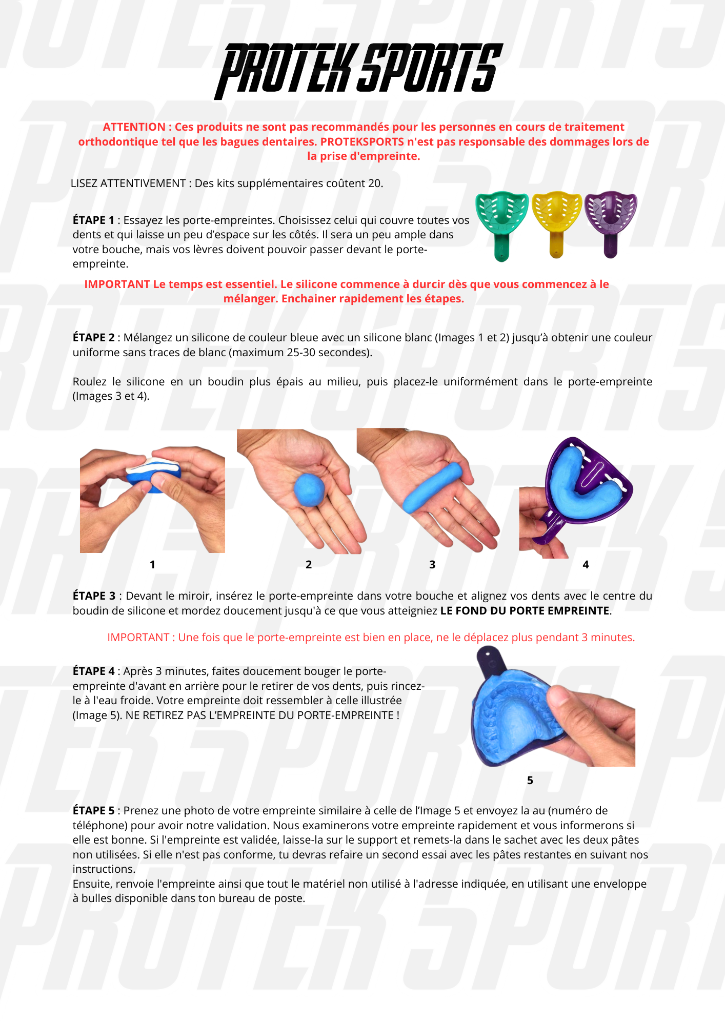 Pour garantir un ajustement parfait de votre protection dentaire sur mesure, une prise d'empreinte dentaire est nécessaire. Ce processus est simple et peut être réalisé à la maison.